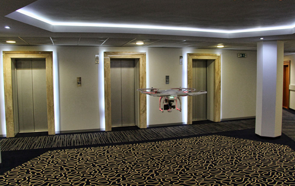 Létání v interiéru s ochrannými kryty vrtulí na dronu (foto UpVision)